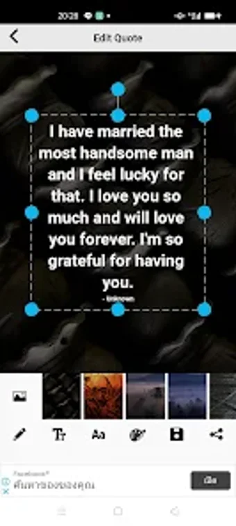 Love Messages for Husband adalah aplikasi Android yang dirancang khusus untuk menyimpan dan mengirimkan pesan cinta kepada suami. Dengan antarmuka pengguna yang bersih dan mudah digunakan, aplikasi ini memungkinkan pengguna untuk beralih antara tampilan kutipan gambar dan teks dengan mudah. Pengguna dapat menyimpan kutipan favorit dan membagikannya melalui email atau media sosial, membuatnya praktis untuk berbagi perasaan kasih sayang.